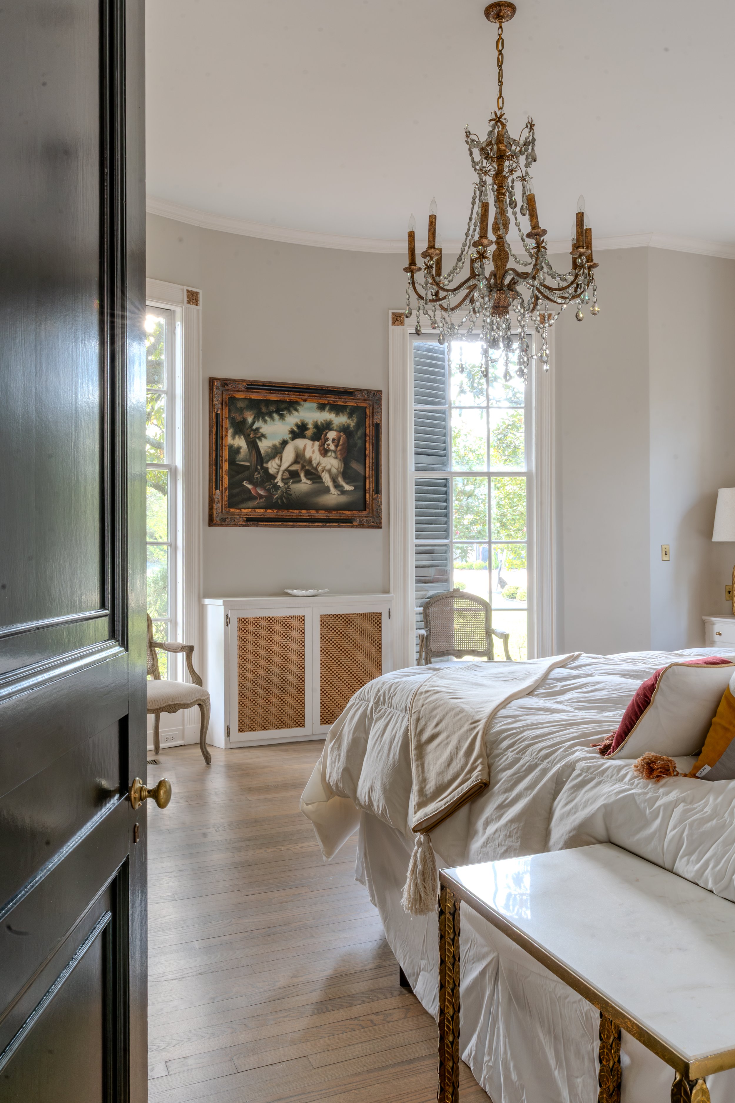 An elegant bedroom with a chandelier, bed with white linens, and vintage furniture, illuminated by natural light from windows.
