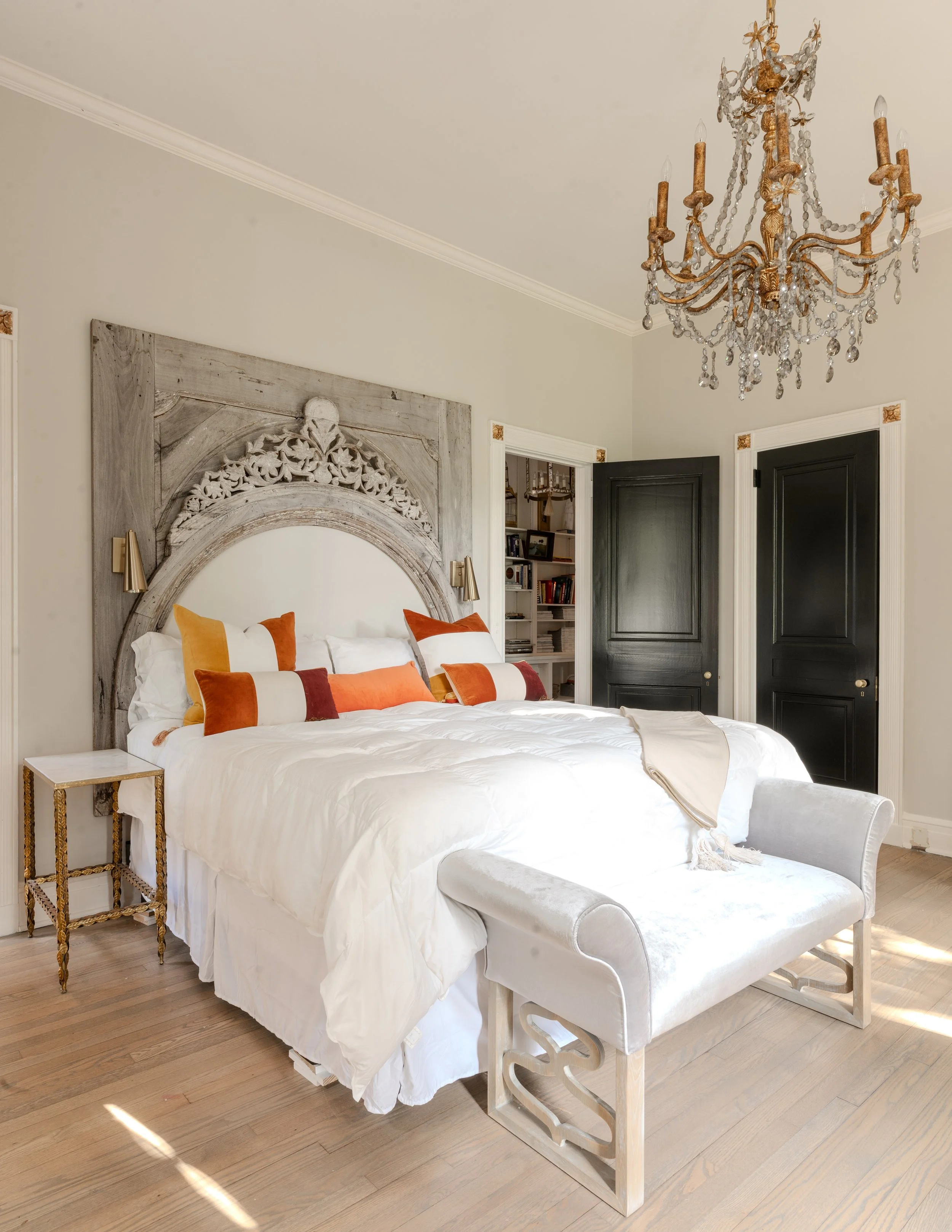 Bedroom with white bedding, decorative pillows, ornate wooden headboard, chandelier, black doors, and a white bench at the foot of the bed.
